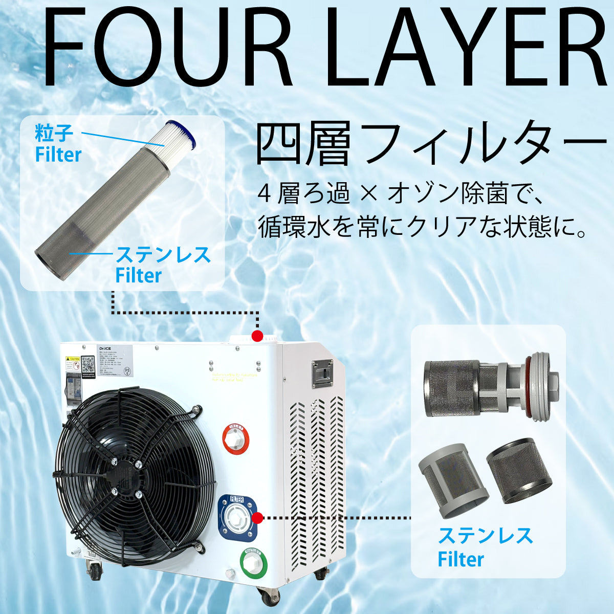微細なゴミ・髪の毛・不純物を4段階で分離する高密度フィルター構造と、 雑菌やにおいの原因物質に作用する内蔵オゾンシステムを搭載。 頻繁な水交換の手間を抑えながら、清潔な循環状態を維持できるため、 プロフェッショナルユースにも応える高衛生・高持続型チラー設計です。